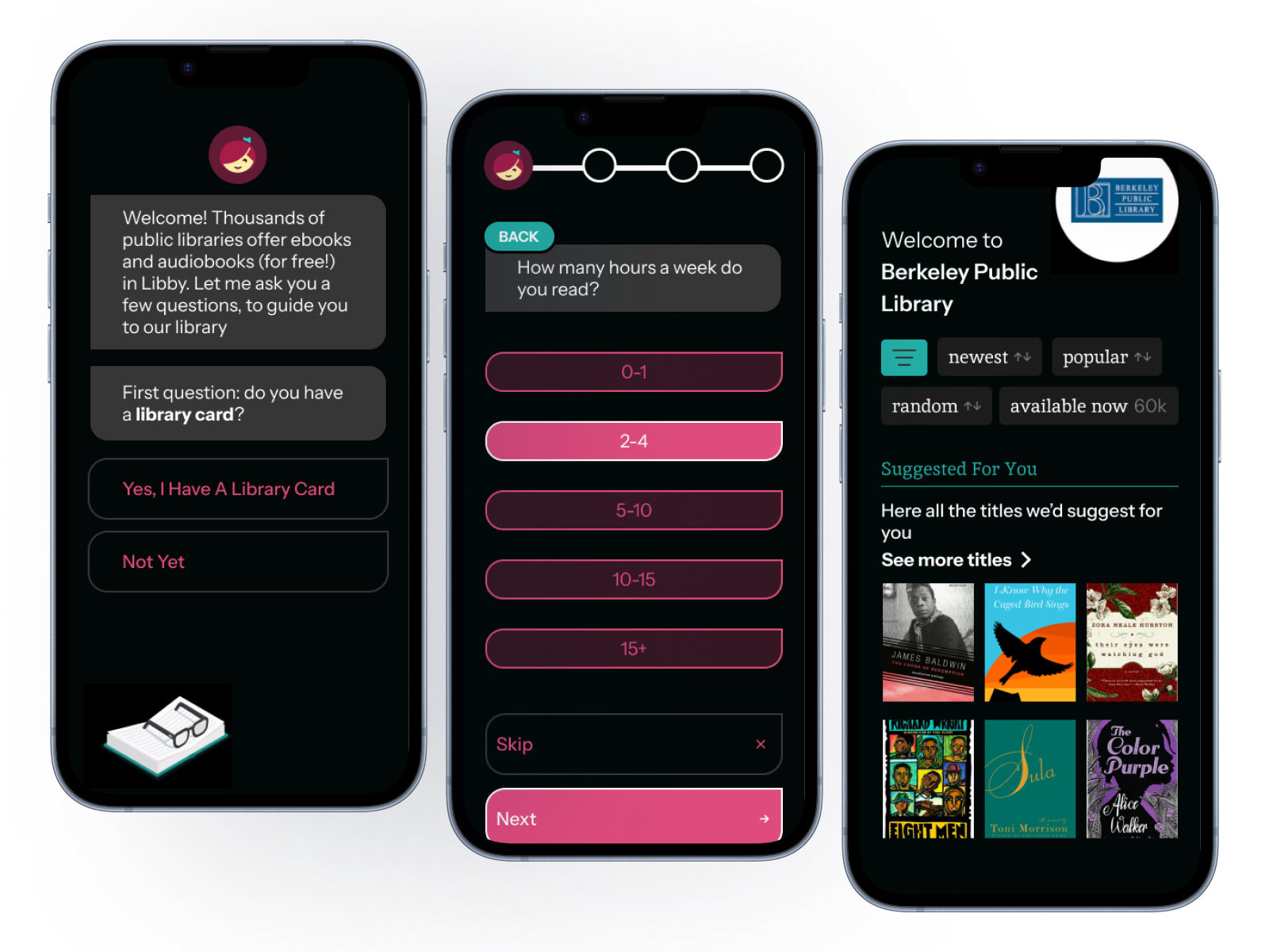 The app currently lacks a way to track user data and provide recommendations to users. I designed an onboarding feature that allows Libby to track users’ reading in order to provide personalized content suggestions. This feature is intended to increase the amount of time users spend on the app as well as minimize breaks users take between reads.