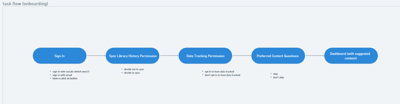 I created a task flow to get a high-level sense of the steps involved in the onboarding process. The bullets beneath each step in the task flow represent potential divergence points and additional screens I’d need to keep in mind when building my user flow.