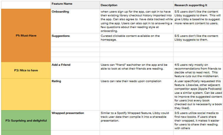 In the end, I prioritized the onboarding/suggested content feature because it is essential to give users a strong foundational experience before adding more complex features. Allowing users to customize their content suggestions starts Libby down a path that these above mentioned “Nice to Have” and “Surprise and Delight” features could later accentuate.