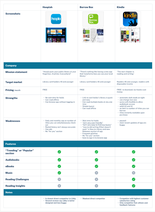 Following preliminary interviews, I researched Libby’s biggest three competitors: Hooplah, Borrow Box, and Kindle. Like Libby, Borrow Box and Hooplah allow users to check out content from their library using their library card. Kindle occasionally has free reads, but is a for-profit subsidiary of Amazon where users can buy online content to view on their device. I selected these competitors based off of functional relevance as well as popularity.