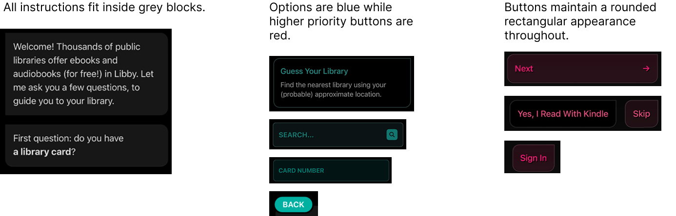 I utilized features within Libby’s existing UI to inform my design of the new feature. I paid close attention to active and inactive button states, as well as Libby’s use of shape and color to indicate meaning. I noticed patterns and kept them in mind throughout my design: