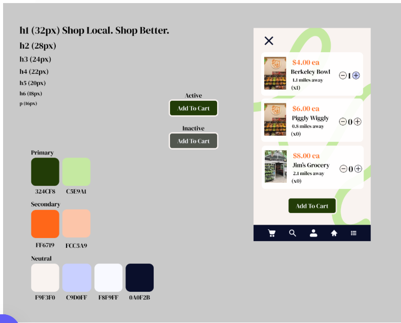 Before designing hi-fi wireframes, we needed to establish Shop Local’s brand values and aesthetic. A delicate balance was struck: convenient yet community centric, intentional yet intuitive.
